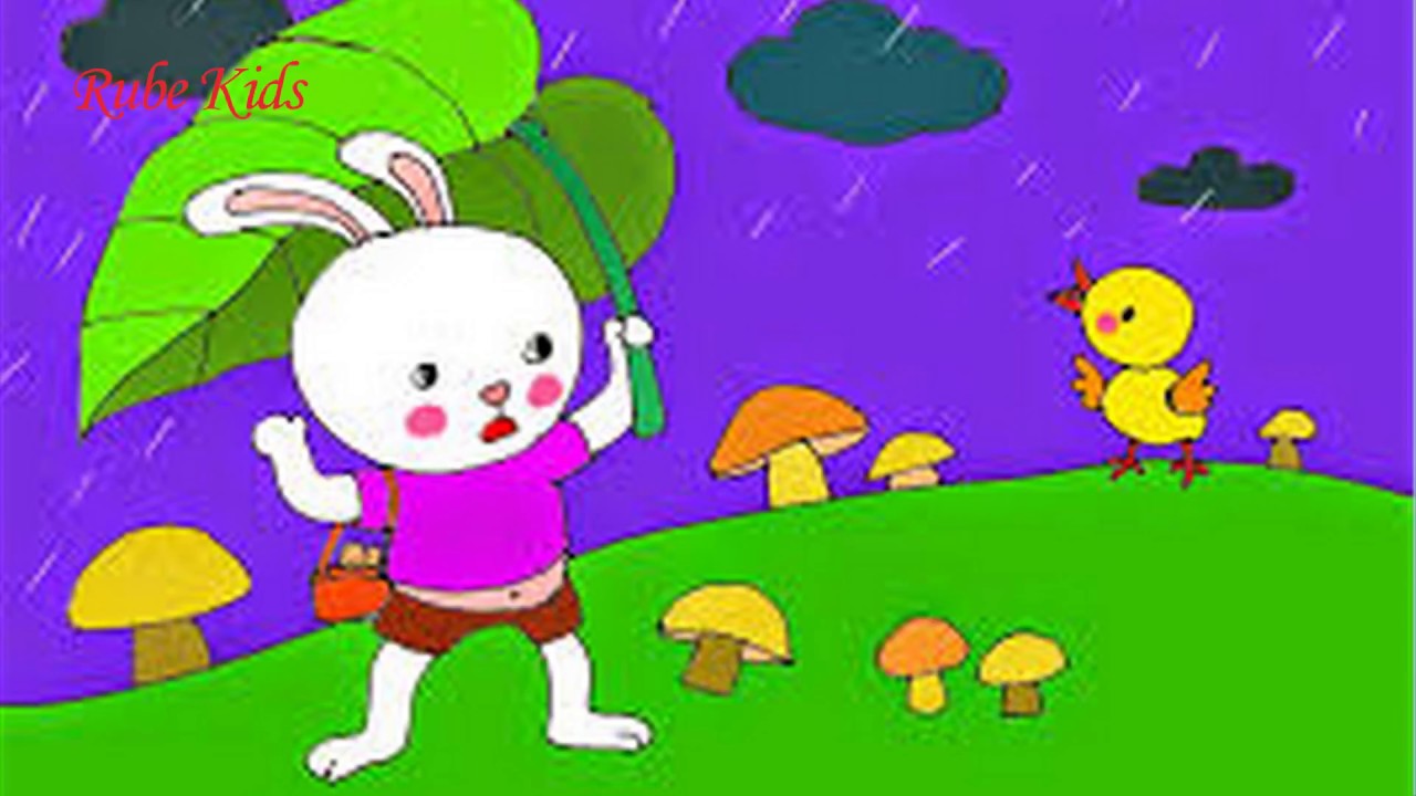 Một buổi sáng đẹp trời, Thỏ trắng thích thú chạy nhảy, ngắm hoa, hái nấm trên bãi cỏ xanh mướt. Bỗng nhiên, trời nổi gió và mưa như trút. Thỏ Trắng vội bẻ ngay lá to làm ô che đầu để khỏi bị ướt.; Đi được một quãng, Thỏ Trắng nhìn thấy một chú Gà Con miệng kêu “ chiếp chiếp “, chẳng có gì để che đầu. Thỏ Trắng vội gọi: